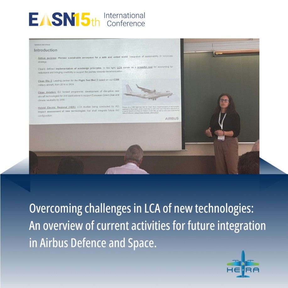 HERA actively participated in the 15th EASN International Conference, presenting its vision for the third era of aviation during a dedicated roundtable alongside projects HERWINGT, HERFUSE, HECATE, and ODE4HERA. The session featured a comprehensive overview of HERA by Giuseppe Piscopo and a technical presentation by Deborah Neumann on overcoming challenges in Life Cycle Assessment (LCA) for new technologies and their future integration in Airbus Defence and Space. Presentation materials were shared publicly via Zenodo to enhance dissemination and stakeholder engagement.